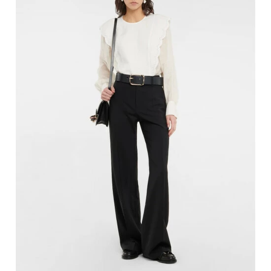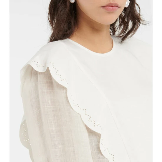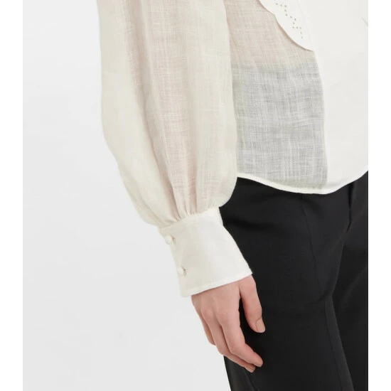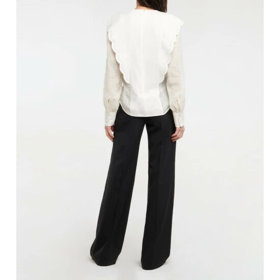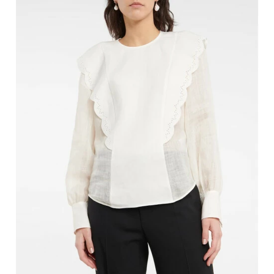 This romantic blouse from Chloé is made from loosely woven linen with a canvas panel. It’s finished with scalloped broderie anglaise trims.