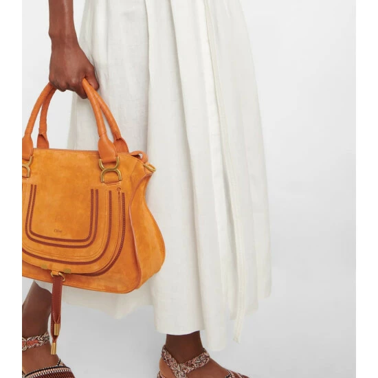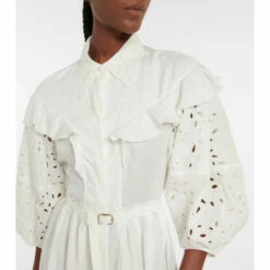 This long dress from Chloé is made from linen gauze with broderie anglaise detailing on the collar and balloon sleeves. It features ruffled trims, mother-of-pearl buttons and a same-fabric buckle belt that defines the waist.