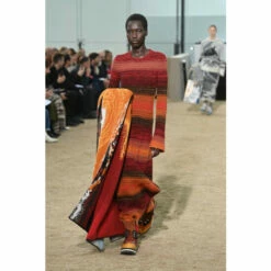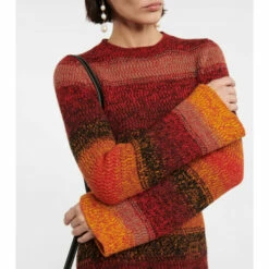 This knitted midi dress from Chloé is made from recycled cashmere and detailed with irregular stripes in graduated warm tones. It features a feminine figure-skimming fit, a round neck, and long trumpet sleeves.