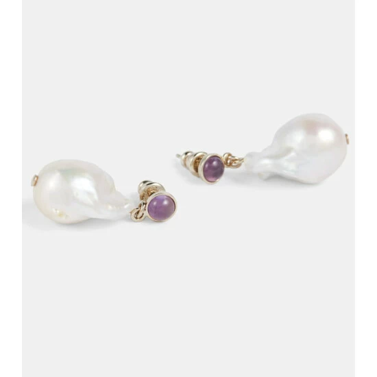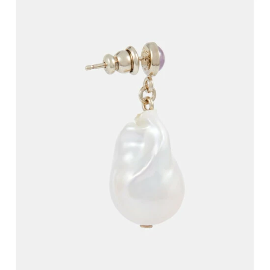 Set with amethyst stones, Chloé’s Darcey earrings have a drop silhouette made from Baroque pearls and secure with stud fastenings.