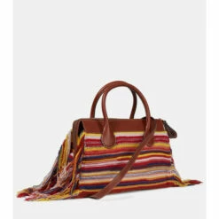 Chloé epitomizes the beauty of bohemian chic with the large multicolored Edith tote. This masterpiece is made from recycled cashmere in a striped pattern and trimmed with playful fringing. It features a front leather pocket with functional buckles, a characteristic logo-embossed leather tag and a softly structured silhouette.