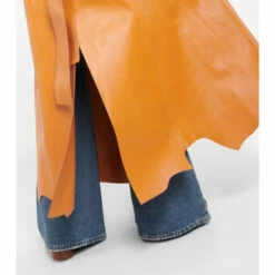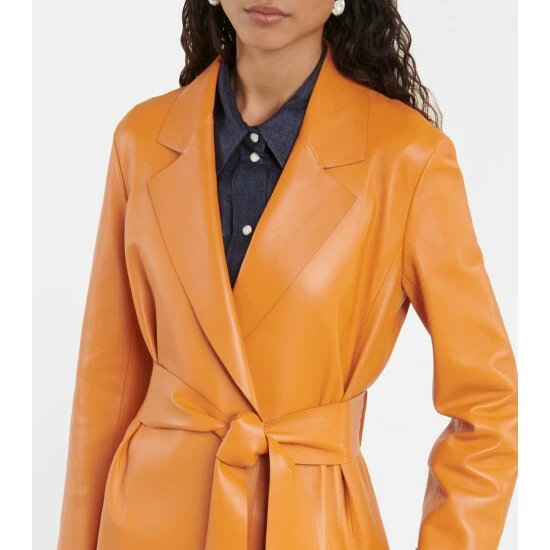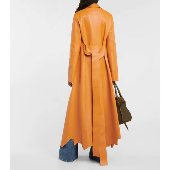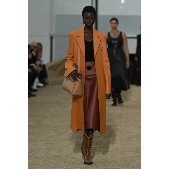 Aptly named the Generous coat due to its ample volume, this design is crafted from soft nappa leather. It has a raw hem, a fluid silhouette and a matching belt.