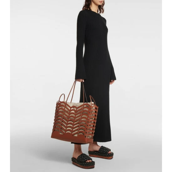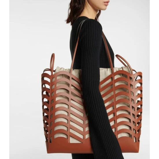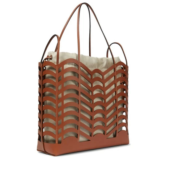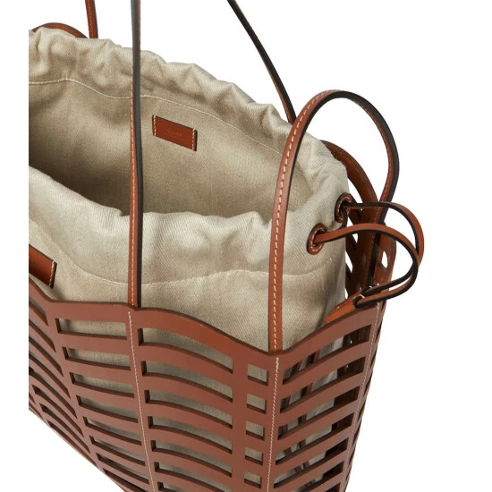 With its filigree cutout pattern, the Kayan leather tote from Chloé marries artisanal craft with label-typical charm. It holds a linen drawstring bag with a drawstring closure to house all the everyday essentials.