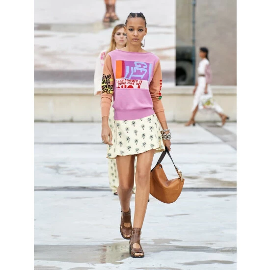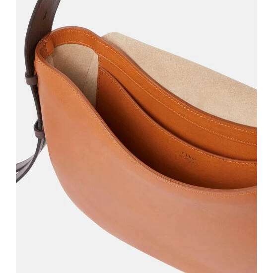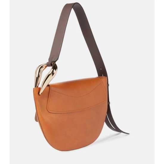 Debuted on the Spring ’21 runway show, Chloé’s Kiss shoulder bag reflects the season’s penchant for minimalist-with-a-twist design. Made in Italy from buttery tan calf leather, it has a satchel silhouette and a contrasting brown strap with sculptural gold-tone hardware.