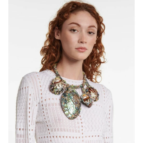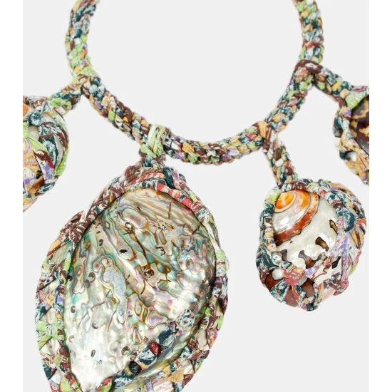 The Larry necklace from Chloé has been crafted from strips of crêpe de chine, and is embellished with Trubo Sarmaticus, Haliotis Iris and Patella Testudinaria shells. Each type of shell has been mindfully selected in accordance with the brand’s commitment to lowering its environmental impact.