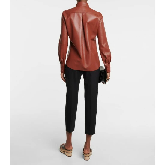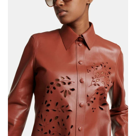 Shaped into the classic shirt silhouette, this Chloé style was crafted in Italy from soft lamb leather in a chocolate brown hue and artfully laser-cut with a leaves motif.