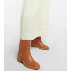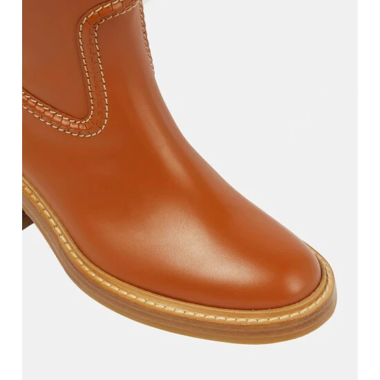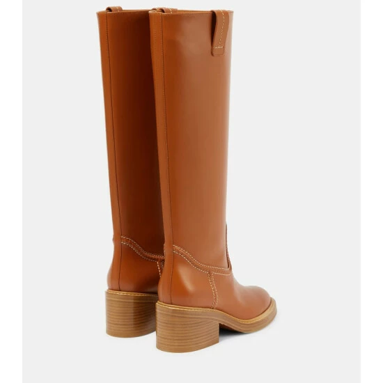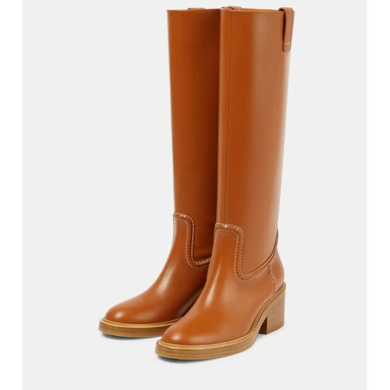 Crafted with a signature ’70s sensibility, these brown leather boots from Chloé have a knee-high silhouette and are punctuated with contrasting topstitching.