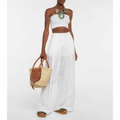 Chloé’s beloved Marcie line receives a summer-ready addition in the form of this beige basket bag. Woven from natural raffia to a capacious silhouette, it has rolled top handles, and is accented with tan-brown leather paneling on one side, complete with the label’s signature horse shoe-style embroidery.