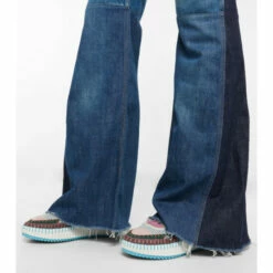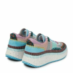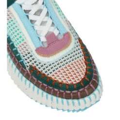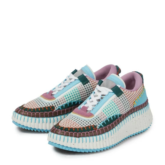 The Nama sneakers by Chloé present a tapestry of modern elements. This low-top style is made with recycled fibers and features hand-stitched mesh uppers, contrasting ridged soles, and signature branding.
