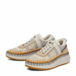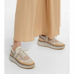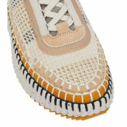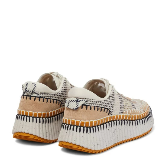 The eco-friendly Nama sneakers from Chloé are made from partially recycled mesh and set on lightweight rubber soles. This beige design has colorful hand-stitched threads and branding on the heel counters, which are made from Leather Working Group-certified suede.