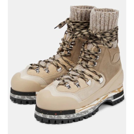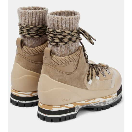 Embark on a new style journey in the hybrid Nikie hiking boots from Chloé. Taking inspiration from vintage ski boots, the calf leather uppers are balanced with insulating knit cuffs and rest atop grooved rubber soles to ensure superior grip.