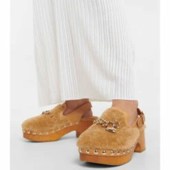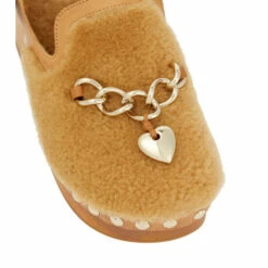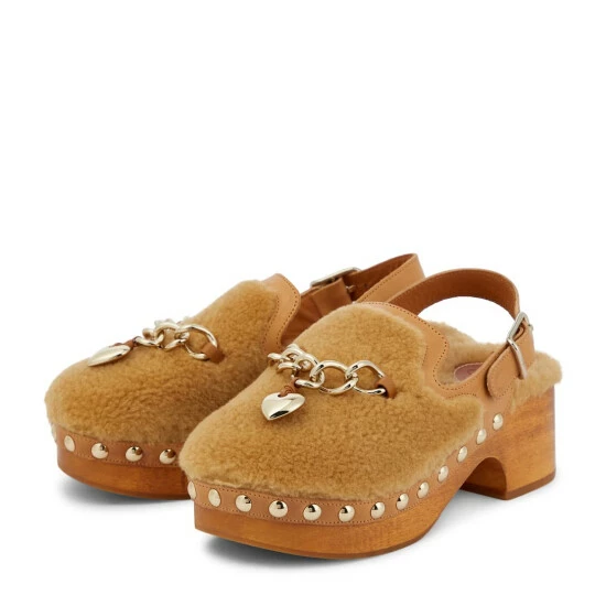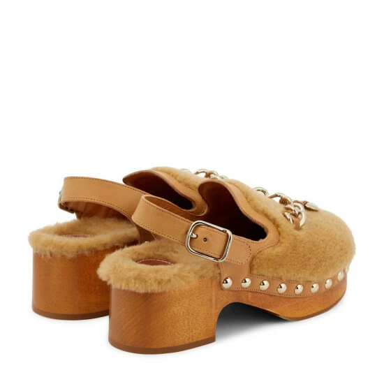 Keep your feet warm as temperatures drop in the playful and charming Ninna slingback clogs from Chloé. They feature leather ankle straps and a brown shearling upper adorned with a gold-tone charm.