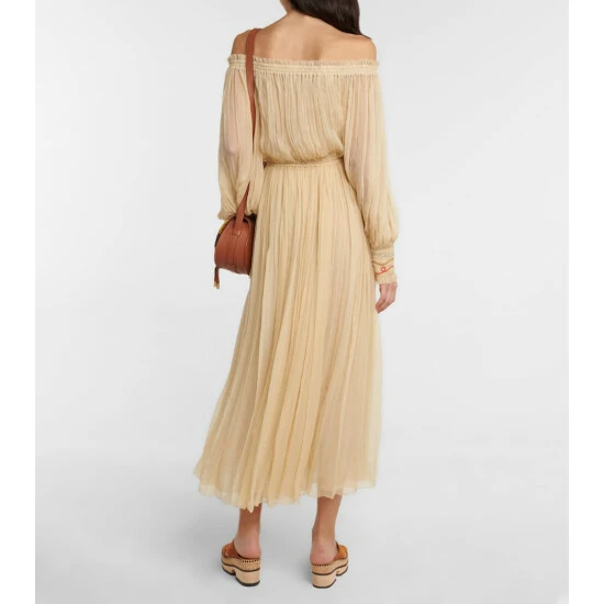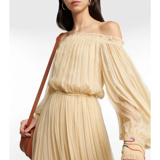 Tailored with signature bohemian flair, this silk dress from Chloé is gently pleated and artfully embroidered at the cuffs.
