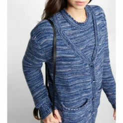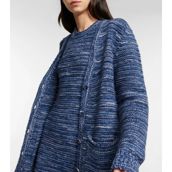 Inspired by ocean waves, this cardigan from Chloé is knit from recycled cashmere yarns of varying blue hues. Shaped to a relaxed, oversized silhouette, it’s finished with large patch pockets and hand-painted ceramic buttons.