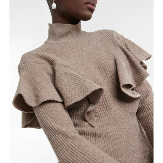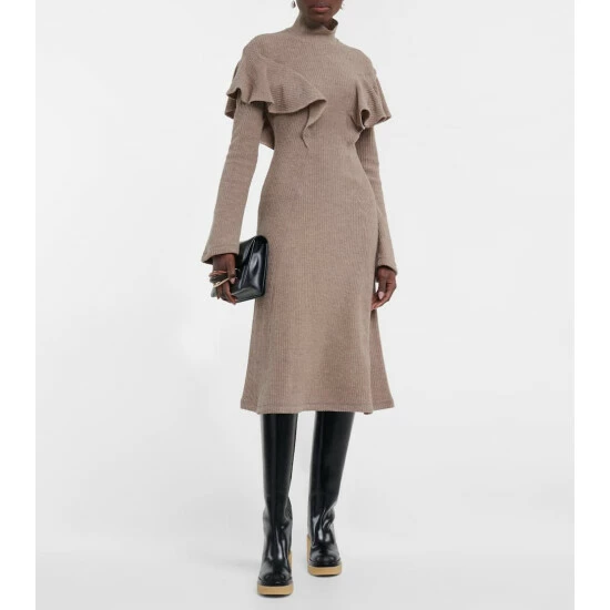 This gently ribbed midi dress from Chloé is crafted from virgin wool, with long sleeves, a high collar, and ruffle detailing.