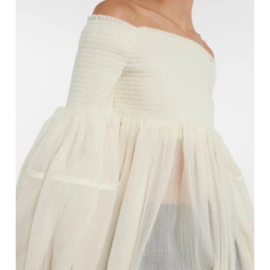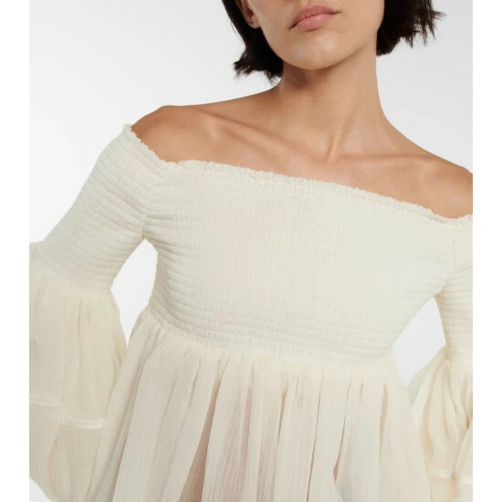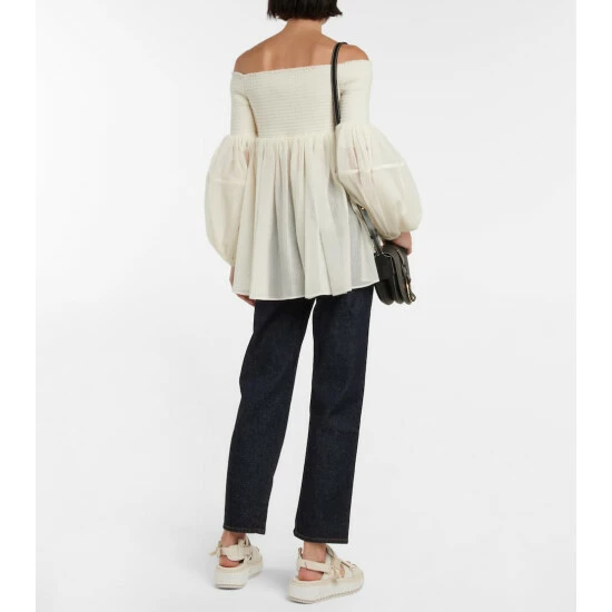This Chloé top is shirred at the chest and upper sleeves so it’ll maintain its off-shoulder neckline well. Made from virgin wool gauze, it has a flattering empire waist and loose bodice.