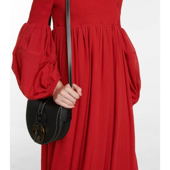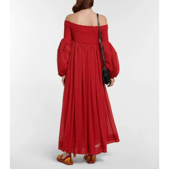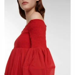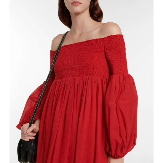 If romance was a dress, it’d be this Chloé piece. Cut from layers of semi-sheer wool gauze, it has a shirred off-shoulder bodice and coordinating sleeves that sprangle out voluminously just above the elbows.