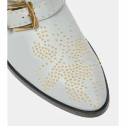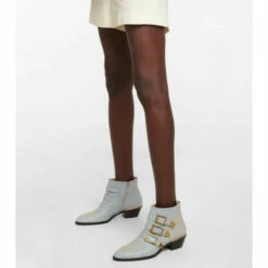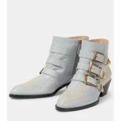Embrace studs the Chloé way with the Susanna ankle boots. Smooth gray leather contrasts harmoniously with high-shine gold studding, finished with striking triple buckle straps and Cuban heels.