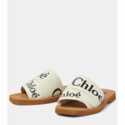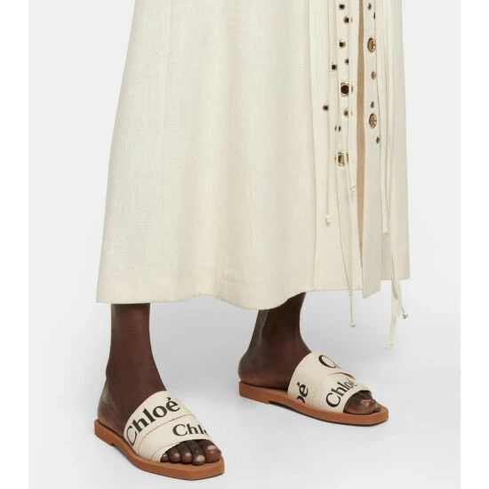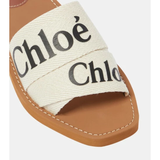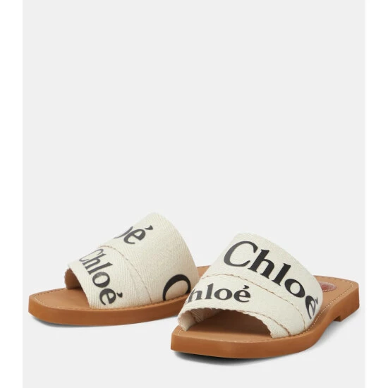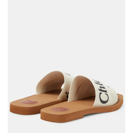 Chloé puts a logocentric spin on warm-weather dressing with these beige Woody slides. They have overlapping white canvas straps and low-stacked rubber soles.