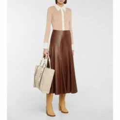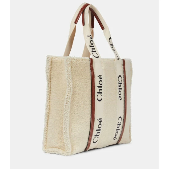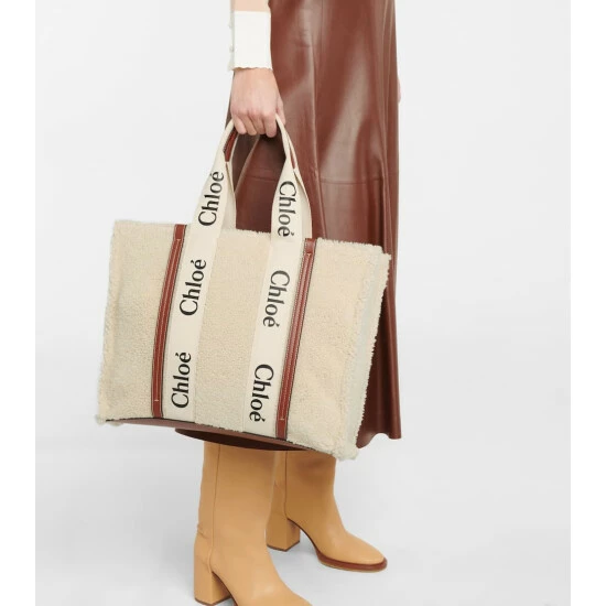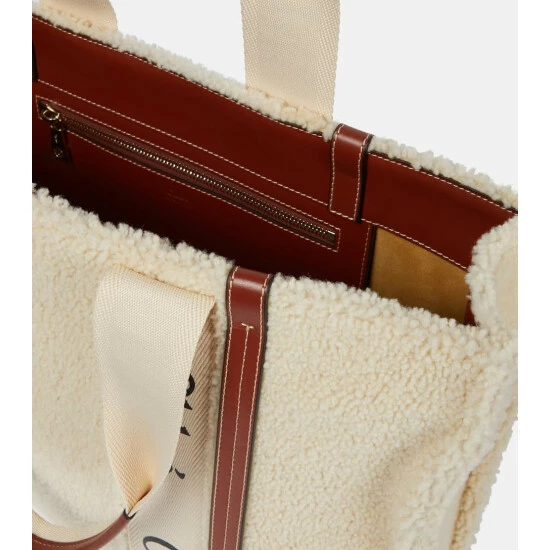 Chloé’s beige woody tote showcases the brand’s famed bohemian and quintessentially Parisian aesthetic. Lined with luxuriously soft shearling, this spacious design has a sharp, modern silhouette, and is trimmed with brown leather and signature logo webbing.