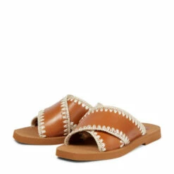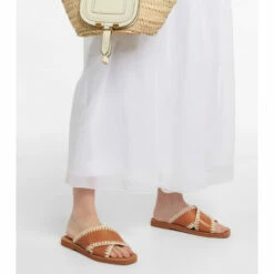 These Woody leather slides from Chloé are defined by blanket stitching and crochet trims at the crossover leather straps. Note the embossed monikers for subtle branding.