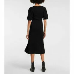Shaped for a beautiful silhouette, this Chloé midi dress is defined by its scoop neckline, dramatic puff sleeves, and gorgeously draped, flared hem. It’s expertly knit from wool and cashmere.